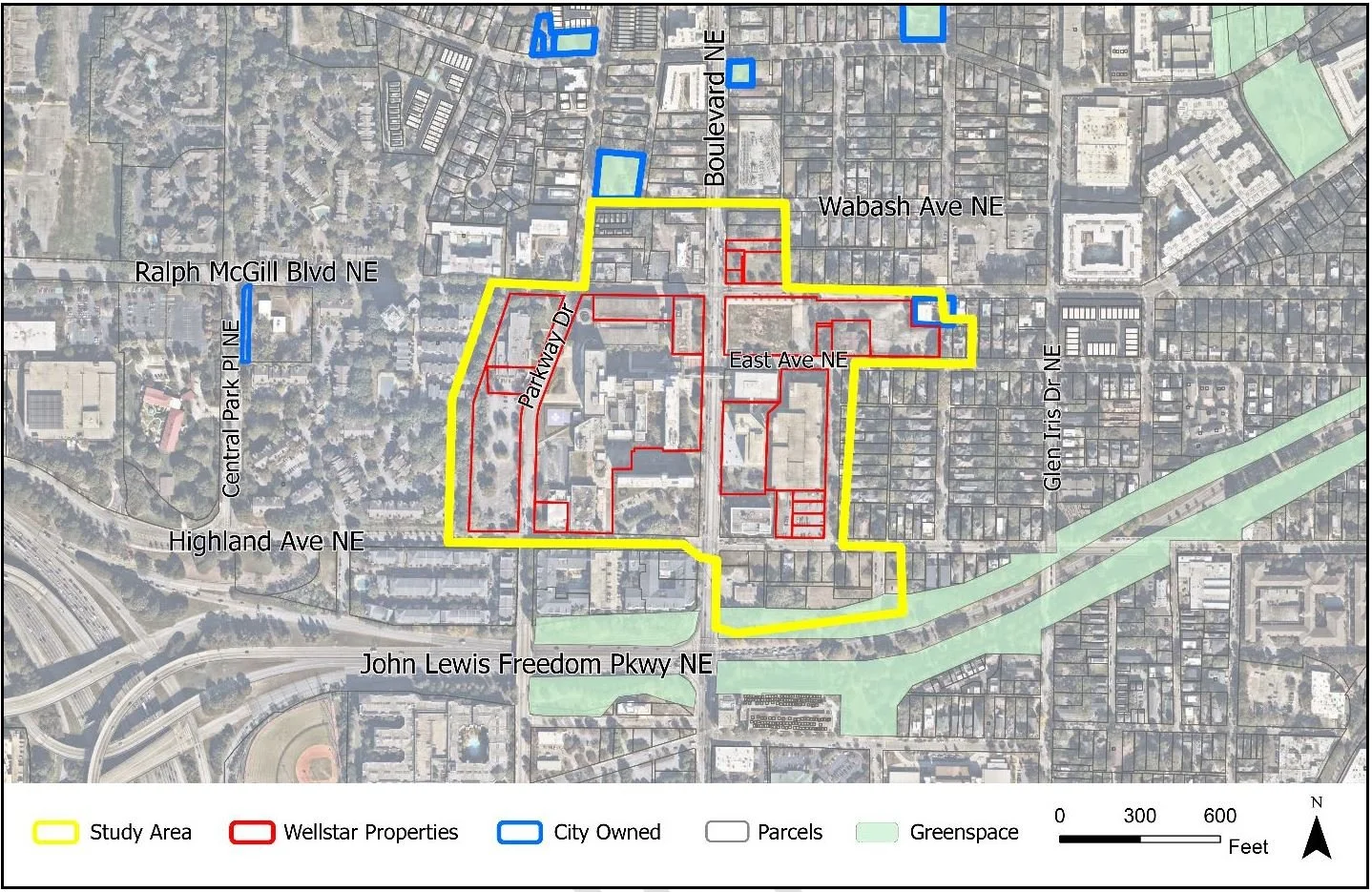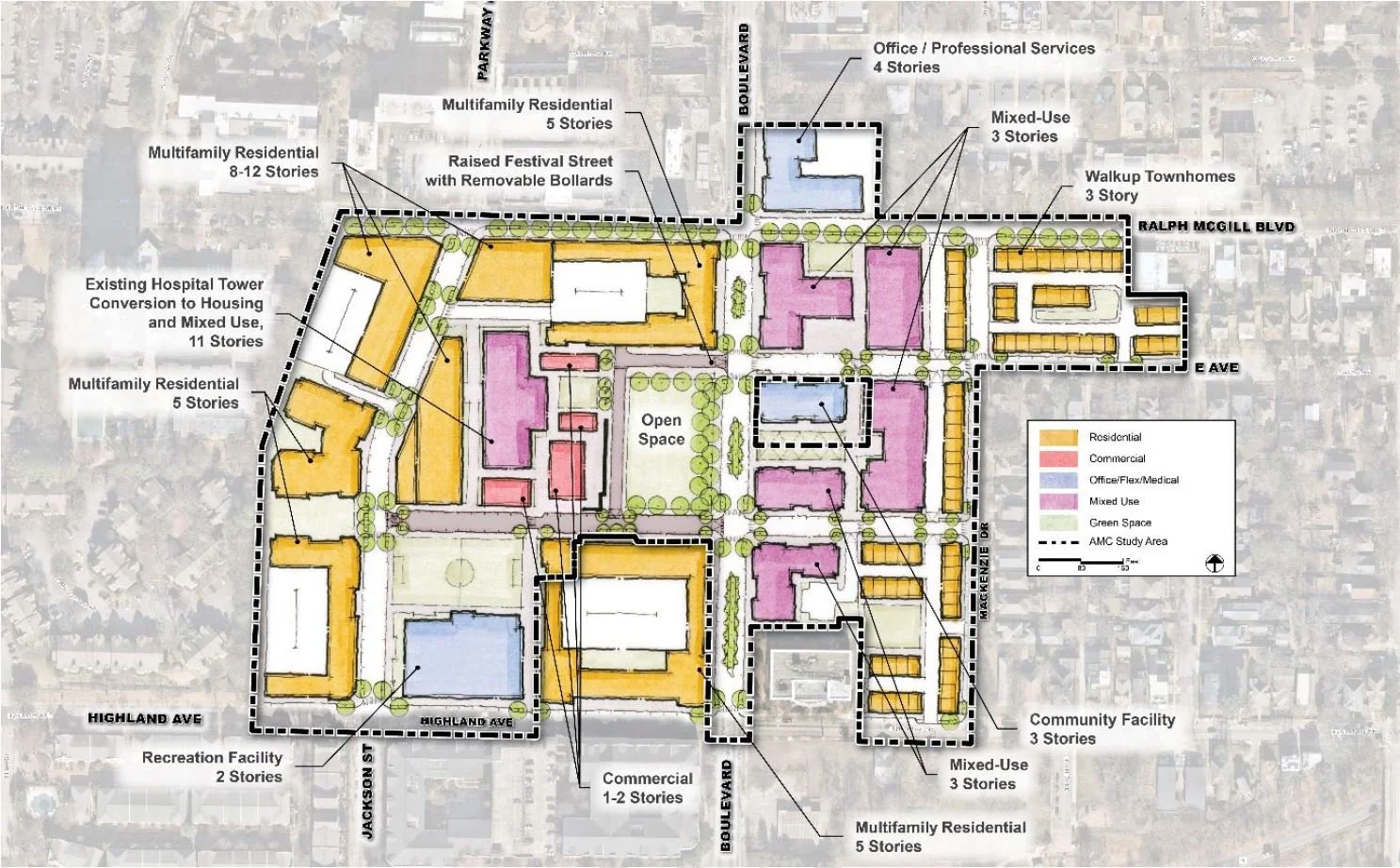 Led by the Department of City Planning in collaboration with Kimley-Horn, the Boulevard Atlanta Medical Center Small Area Plan (AMC Small Area Plan) is a plan for the potential future redevelopment of the former Atlanta Medical Center site and nearby parcels into a vibrant, residential, and mixed-use community. The planning process involved extensive stakeholder and community engagement to ensure that the Plan reflects the needs and aspirations of the Old Fourth Ward (O4W) community. Through future land use and zoning/regulatory changes, the Plan proposes a gradual increase in density and development intensity from east to west across the study area. The Plan promotes a mix of uses and neighborhood cohesion. In addition, the Plan proposes the potential retention of medical services, the integration of greenspaces, and enhanced connectivity and walkability across the site.
