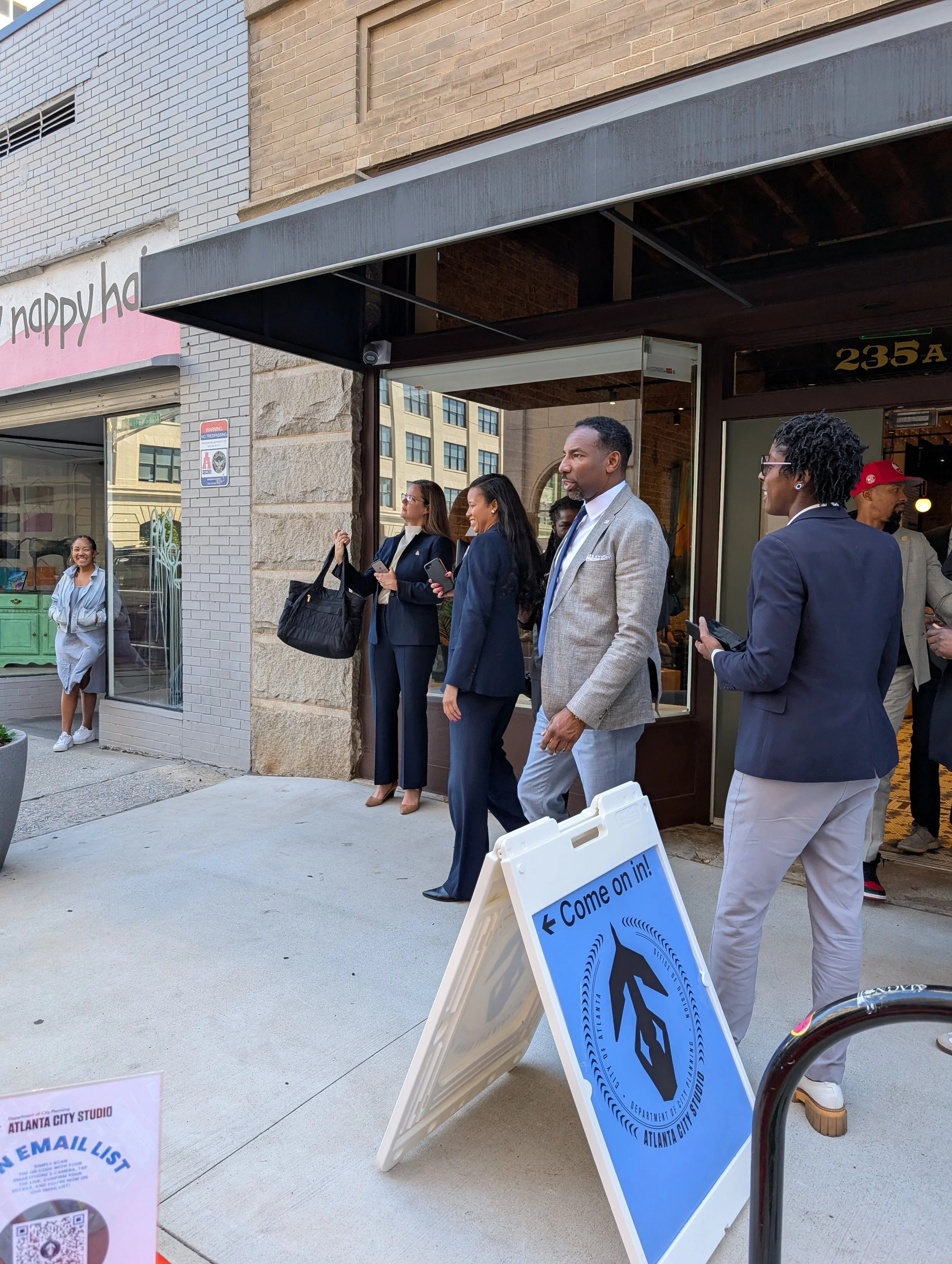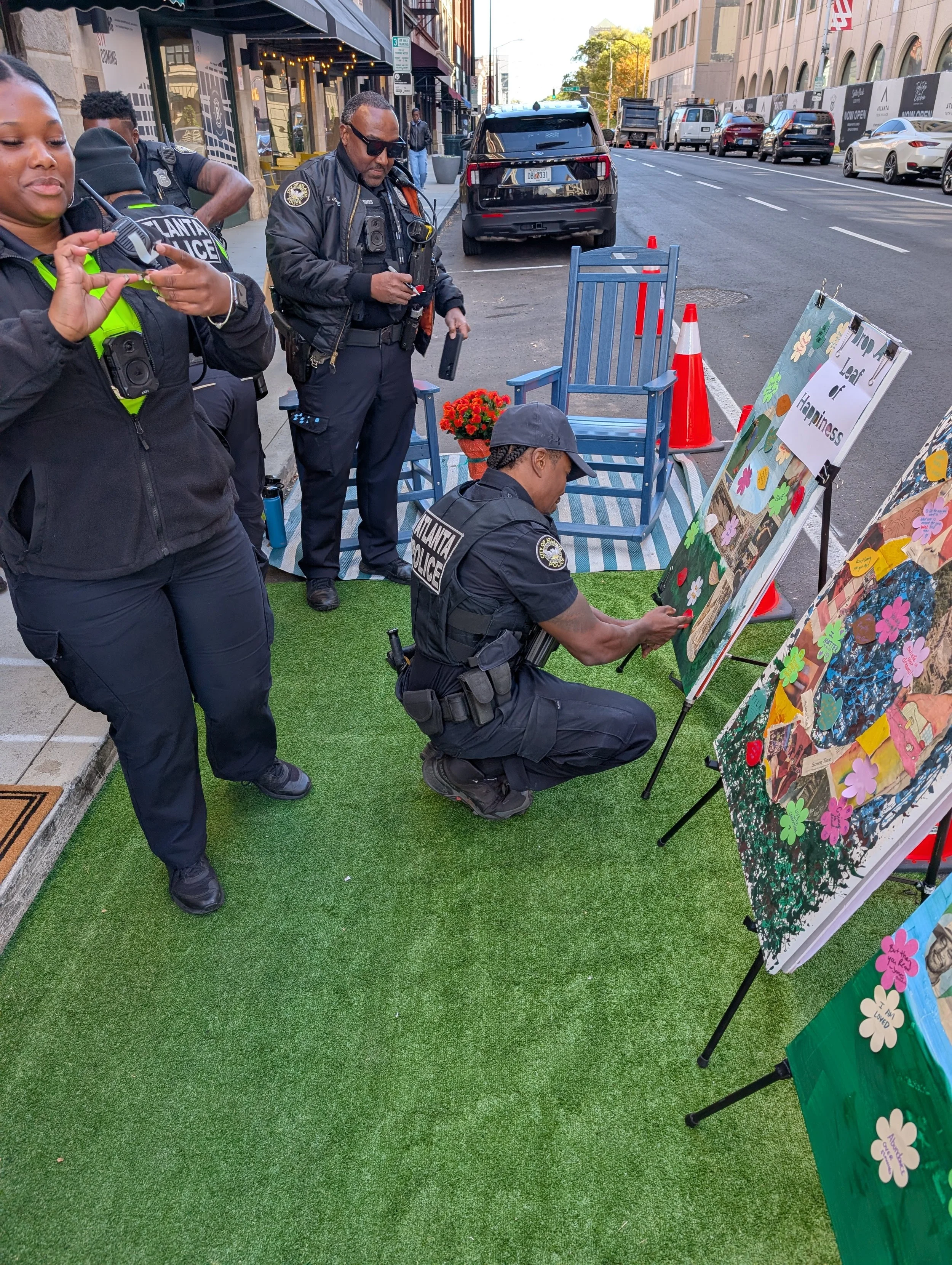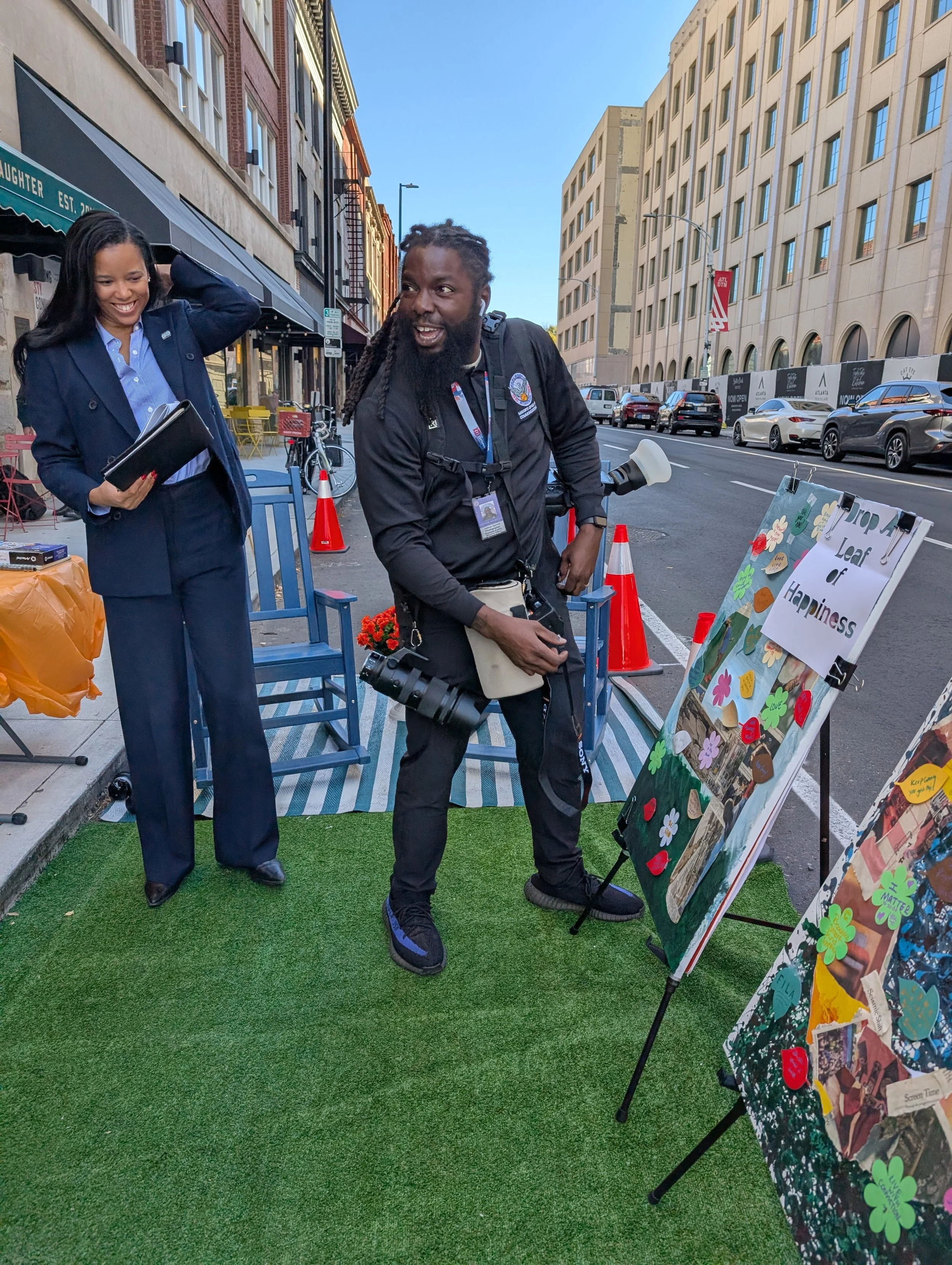 Building on the Park(ing) Day concept, Downtown Day transformed two parking spaces into a pedestrian-focused green space that encouraged community interaction and reflection. The activation featured mental health–conscious art, inviting participants—including a surprise visit from the mayor and local law enforcement—to contribute affirmations to a shared community art board. Local creatives joined organic conversations on the Atlanta City Studios porch, sharing their stories and connecting with our team. By offering a hands-on experience of people-centered public space, the demonstration highlighted the power of small-scale interventions to foster community healing, celebrate local creativity, and inspire advocacy. Through this experiential approach, participants saw firsthand how public spaces can prioritize people over vehicles, strengthening connections and inspiring long-term support for human-focused urban streets and neighborhoods.