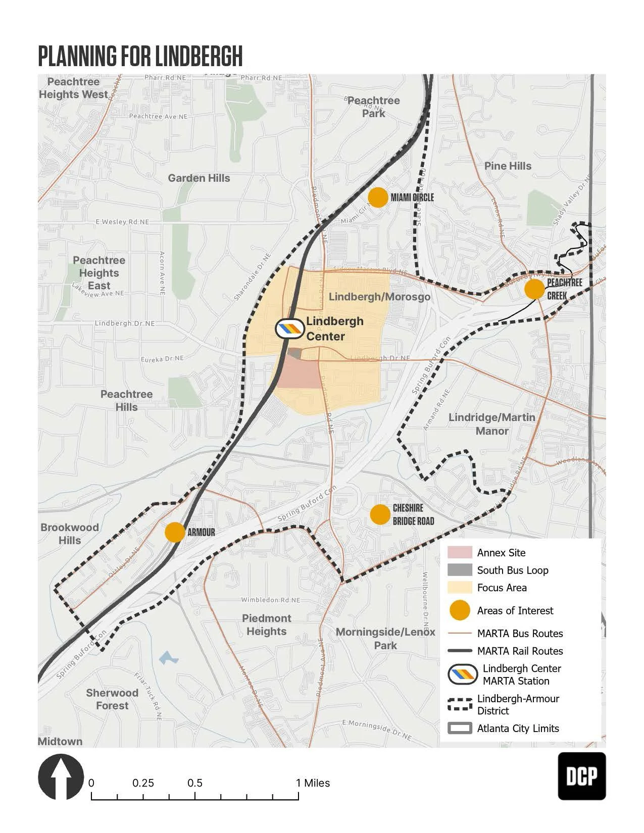The project’s primary Focus Area is the ¼-mile radius surrounding the Lindbergh-Center MARTA Station. The project will be structured as a phased planning initiative with two key components: the development of conceptual plans for two MARTA properties adjacent to the Lindbergh-Center MARTA Station and the creation of an Urban Design Framework (UDF) for the ¼-mile core of the Lindbergh-Armour District. The project will also consider connections from the core to adjacent “Areas of Interest,” which are notable commercial nodes or natural features within the Lindbergh-Armour District but outside the core.